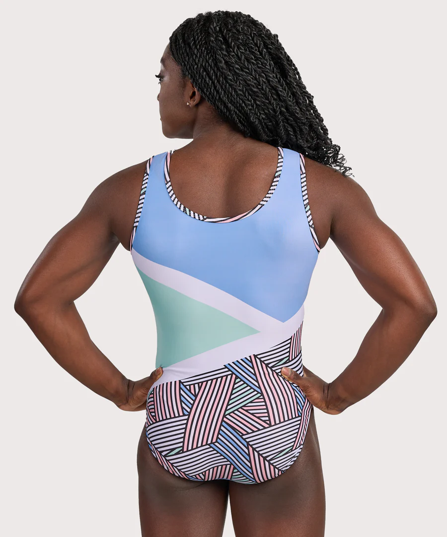 Make a bold statement with the Geo Pop traditional tank leotard! This leotard is a celebration of pastel perfection, featuring graphic lines and cool hues of periwinkle, mint, pink, and white. It's a fresh take on classic gymnastics style, blending artistic design with a playful modern twist.