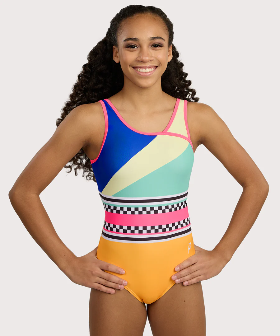 Kick into high gear with the Sports Mode leotard! This vivid spectacle features a swoop tank in electrifying shades of blue, orange, green, and pink, jazzed up with a sporty checkered stripe. The keyhole back is just the cherry on top for a look that’s as fearless as it is fun.